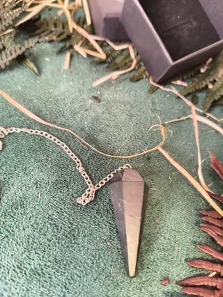 Punta de 4 cm · Cadena de aprox. 20 cm. Este péndulo está elaborado en shungit, una piedra altamente valorada por sus propiedades de protección, purificación y transmutación energética. Su forma facetada permite una respuesta más precisa y una canalización clara en trabajos de radiestesia. ✨ Propiedades de la Shungit: 🛡 Protección intensa contra energías negativas ⚫ Neutraliza vibraciones densas y campos dañinos 🌑 Piedra de enraizamiento, equilibrio y fuerza 🔥 Gran transmutadora de energía 🧿 Ideal para limpiezas energéticas y diagnósticos 💫 ¿Para qué sirve este péndulo? ✔ Consultas radiestésicas de alta precisión