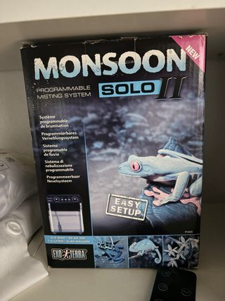 Sistema de nebulización programable Monsoon Solo II de Exo Terra. Incluye el depósito de 1.5 litros. - Modelo: Monsoon Solo II - Capacidad: 1.5 Litros / 0.40 Gallon - Presión: 2.5 BAR / 36.95 PSI - Fácil configuración (Easy Setup) Tiene marcas, únicamente estéticas por la cal del agua como enseño en las imágenes. La bomba, manguera, botones y demás funciona todo perfectamente. No envío.