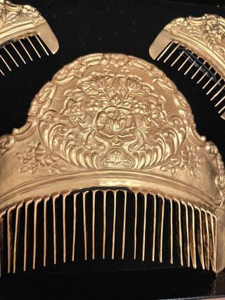 Conjunto de traje de fallera para niña en tonos naranjas y crema, con detalles bordados. - Tejido principal naranja con estampado damasquinado. - Delantal crema con bordados florales. - Cuerpo con cuello y mangas a juego. - Incluye zapatos a juego. -También incluye mantilla 100×190cm