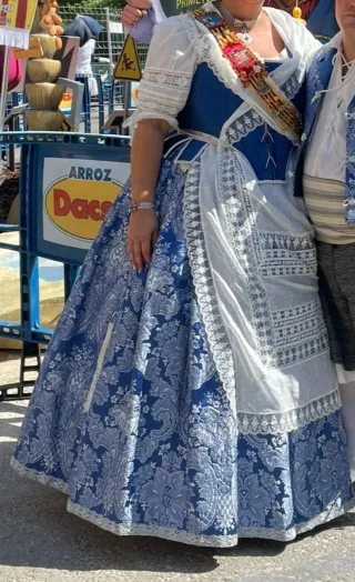 Conjunto tradicional de falda y justillo de huertana. - Falda azul con estampado floral blanco. - Justillo azul con detalles blancos. - Sin manteletas y sin camisa. Medidas Falda 1,08 y Justillo Talle 45, Ancho 55