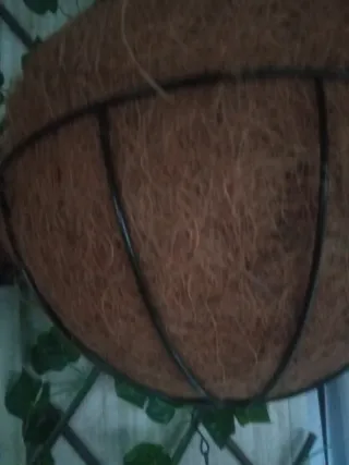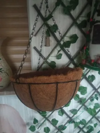 Macetero colgante con cadena para colgar. 27 cm de diametro x 50 cm alto - Material: Fibra de coco. - Cadena metálica para colgar.Hay dos disponibles,cada una 4 euros.
