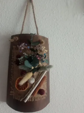 Bonita teja artesanal con arreglos de flores secas. Hay dos diferentes con la misma tematica, flores secas, cada una euros. - Una teja tiene un jarrón blanco con flores secas y detalles en rojo y amarillo. - La otra teja presenta un arreglo floral con hojas verdes, flores secas, rodajas de naranja. 8 euros cada una