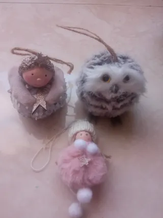 Conjunto de tres adornos para el árbol de Navidad. Incluye un búho y dos figuras de muñeca. - Adorno de búho con detalles grises y blancos. - Figura de muñeca con vestido rosa y gorro blanco. - Figura de muñeca con vestido gris y detalles brillantes.estan nuevos