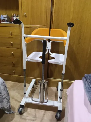 Silla de traslado hidráulica con asiento. - Estructura de metal blanco. - Asiento naranja y blanco. - Ruedas para facilitar el movimiento. - puedes hacer tus necesidades ahí mismo en la silla. - puedes trasladarte de la cama al baño. - puedes bañarte en la silla. Facilita tu movilidad. Precio negociable