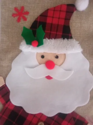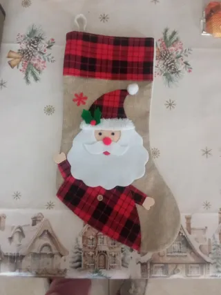 Calcetín navideño con diseño de Santa Claus, ideal para decorar en estas fiestas. - Tela de cuadros rojos y negros. - Adorno de Santa con barba blanca y detalles. - Bola de peluche blanca en el gorro.