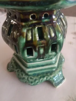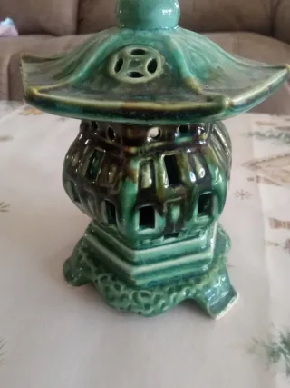 Quemador de incienso de estilo japonés, con un diseño inspirado en las linternas de pagoda.Cuando enciendes el cono sale el humo por arriba , esta nuevo y comprado en tienda de calidad hace años.haz un regalo original estas navidades - Fabricado en cerámica con un acabado esmaltado en verde y detalles oscuros. - Presenta aberturas decorativas en el techo y el cuerpo. - Base con relieve. - Diseño de pagoda de tres niveles.