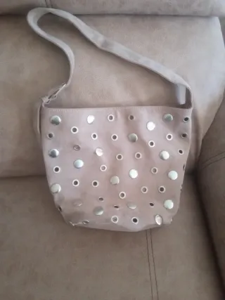 Bolso de ante con un diseño moderno y llamativo. - Material: Ante - Adorno: Tachuelas plateadas - Color: Beige claro