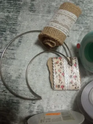 Conjunto variado de cintas y adornos para tus proyectos de manualidades. - Cinta de yute con encaje. - Cinta de raso azul. - Cinta de raso rosa con copos de nieve. - Cinta plateada brillante. - Cinta de raso amarilla. - Cinta de raso blanca. - Cinta de raso con borde de encaje. - Cinta de raso verde. - Cinta dorada con relieve. - Flores de papel en tonos rosa y blanco. - Pequeñas flores blancas y naranjas. - Corazón azul. - Aro metálico.algunas empezadas otras nuevas, todo por 10 euros