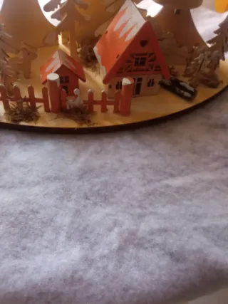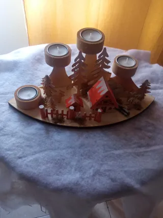 Este portavelas navideño crea un acogedor paisaje invernal. - Diseño de madera con casitas y árboles. - Incluye portavelas para velas pequeñas. - Ideal para decoración festiva.