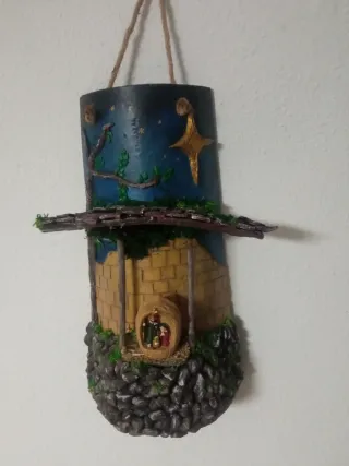 Decoración navideña artesanal con escena del Belén. - Diseño de teja con detalles de noche estrellada y estrella dorada. - Incluye figuras del Nacimiento en una nuez - Base con piedras y vegetación. - Colgante de cuerda para colgar.