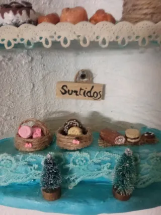 Decoración artesanal con temática de dulces, ideal para colgar. - Diseño de estantería con miniaturas de dulces y panes todas echas a mano. - Colores principales: azul y blanco. - Adornos de hojas y flores. - Letreros decorativos 'Dulces' y 'Surtidos'.
