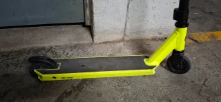Patinete de estilo freestyle con un llamativo diseño en amarillo y negro. Ideal para trucos y desplazamientos. - Manillar negro con puños ergonómicos. - Plataforma de color amarillo brillante. - Ruedas negras. -Con freno de pie
