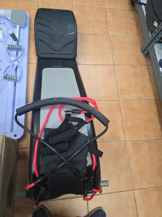 Banco de ejercicios multifuncional con bandas elásticas rojas. Tiene un enganche partido No afecta ver ultima foto - Diseño plegable para fácil almacenamiento. - Asiento y respaldo acolchados. - Bandas de resistencia integradas para entrenamiento.