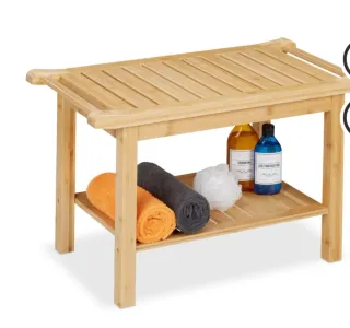 Banco de bambú con dos estantes, ideal para organizar tu baño o ducha. Su diseño natural aporta calidez. Banco de madera para 2 personas Para cuarto de baño o pasillo De bambú Espacio para guardar toallas También como zapatero o soporte para macetas Montada para las fotos - Material: Bambú. - Dos niveles de almacenamiento. - Diseño abierto para ventilación.
