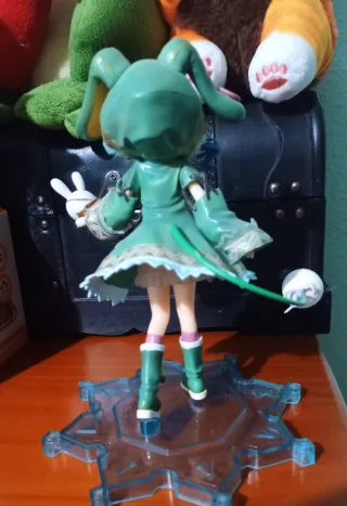 Figura de anime detallada con un diseño único. - Figura de personaje con traje verde y sombrero. - Incluye accesorios como un conejo blanco con parche. - Base de exhibición transparente.