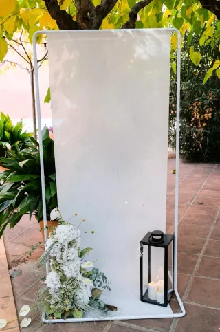 Estructura blanca para photocall o bienvenida en bodas y eventos. Ideal para crear un punto focal. - Marco metálico blanco. - Porta velas incluido ---Tela blanca NO incluida--- ---Centro de flores NO incluido---
