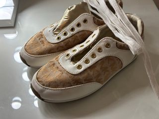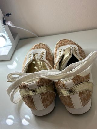 Zapatillas Michael Kors en talla 31. Diseño moderno y cómodo. - Color: Dorado y blanco. - Material: Tela con monograma y detalles en piel. - Cierre: Cordones blancos.
