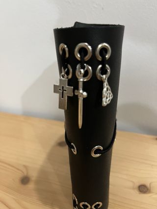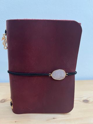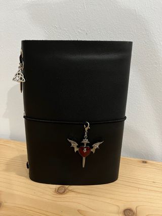 Funda de cuero negra para Bullet Journal. Incluye dos dijes decorativos. - Material: Cuero. - Color: Negro. - Dijes: Trébol celta y corazón alado con espada.