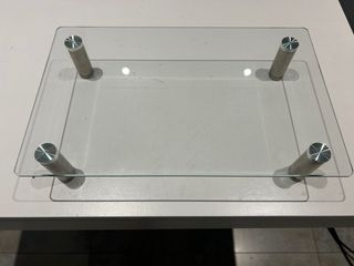 Soporte de cristal templado con patas metálicas. - Diseño moderno y minimalista. - Ideal para elevar monitores o pantallas. - Patas cilíndricas con acabado plateado.