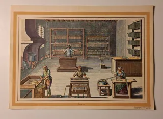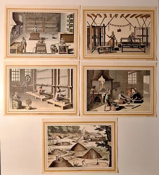 Conjunto de 5 grabados de oficios realizados por Heraclio Fournier en 1972. Miden 32 x 25 cm. Cada grabado representa una escena de trabajo artesanal. Cereros, Herreros, Tejedores, Carboneros, Alfombreros