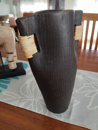 Jarrón de terracota con un diseño rústico y elegante. Sus asas de mimbre le dan un toque natural. - Material: Terracota. - Color: Marrón oscuro. - Asas: Mimbre.medidas 30 x20 cms