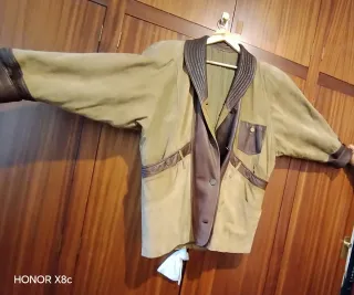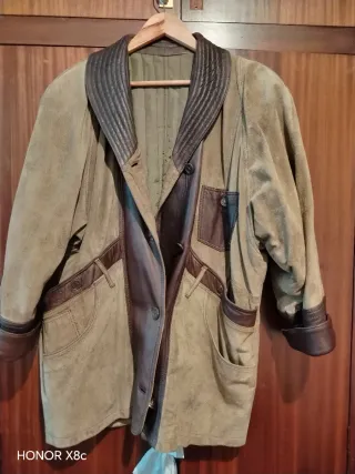Chaqueta de ante con detalles en piel. - Color verde militar y marrón. - Cuello de solapa con textura. - Cierre de botones. - Bolsillos frontales con solapa.