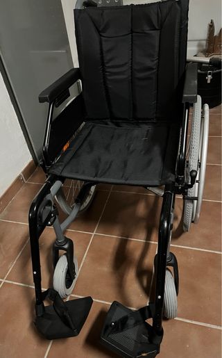 Silla de ruedas plegable, ideal para facilitar la movilidad. - Asiento y respaldo acolchados. - Reposapiés ajustables. - Ruedas traseras grandes y delanteras giratorias.