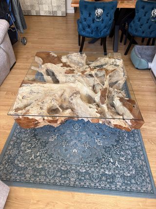 Mesa de centro con un diseño orgánico y natural, perfecta para dar un toque especial a tu salón. La base está hecha de madera natural con formas únicas y se complementa con una tapa de cristal. - Base de madera natural con diseño de raíz. - Tapa de cristal. - Pieza de diseño llamativa.
