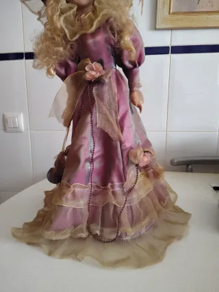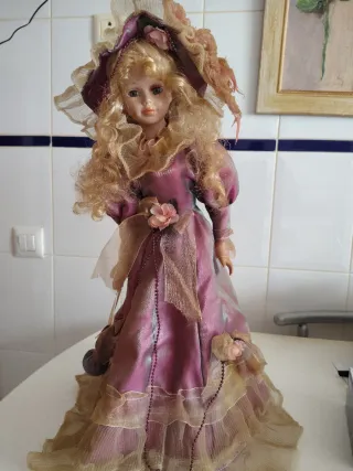 Preciosa muñeca de porcelana con un vestido detallado y sombrero. - Vestido largo de color rosa con adornos dorados. - Sombrero a juego con encajes y flores. - Cabello rubio largo y ondulado. - Adornos de cuentas y lazos en el vestido.