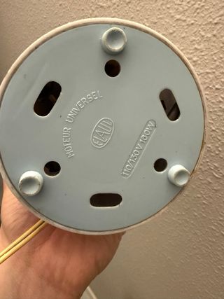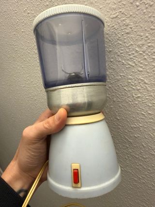Molinillo de café de estilo vintage, perfecto para añadir un toque retro a tu cocina. Su diseño combina materiales duraderos y un acabado clásico. Se le quito el enchufe para que a nadie se le ocurra enchufarlo a 220 en esa epoca era 110v - Cuerpo principal de plástico azul claro. - Depósito superior transparente. - Base metálica plateada. - Interruptor de encendido/apagado rojo.