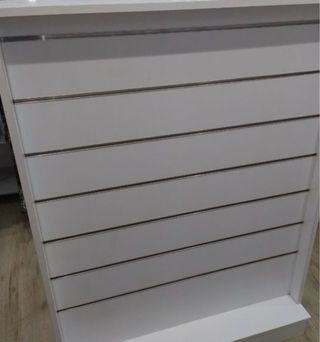 Mueble expositor de diseño moderno, ideal para tiendas. - Estructura blanca. - Líneas horizontales con detalles metálicos.