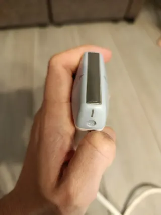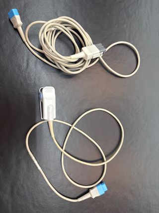 Sonda para pulsioxímetro de adulto de la marca General Electric. - Conector azul y gris. - Cable enrollado.