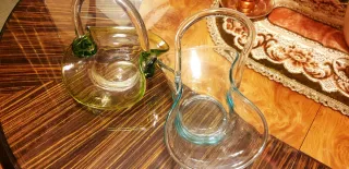 Elegante jarrón de cristal con un diseño único y llamativo. Su combinación de colores lo hace destacar en cualquier espacio. - Fabricado en cristal de alta calidad. - Tonos verdes y transparentes que crean un efecto visual atractivo. - Asa curva para un toque distintivo.