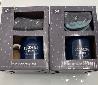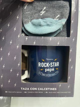Conjunto de taza y calcetines con diseño Rock Star Papá. - Taza de color azul con texto Nuestro Rock Star Papá. - Calcetines grises con estampado de rayos. - Incluye una taza y un par de calcetines.