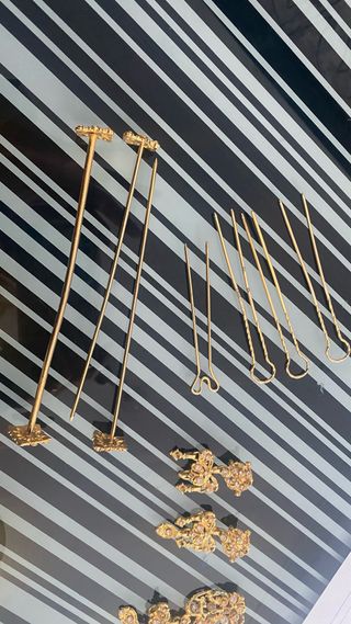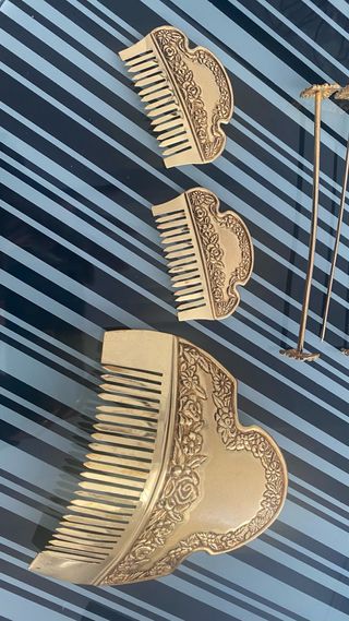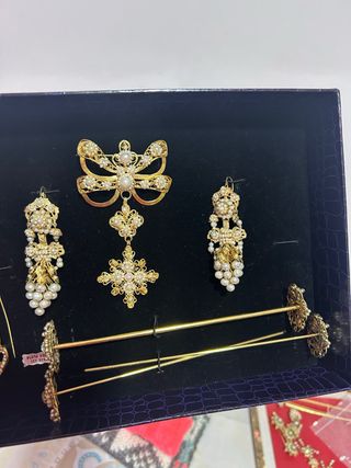 Conjunto de aderezo de fallera, nuevo solo puesto una vez. Pieza elegante y tradicional. Forma razimo. Nuevo costó 768€. - Plata chapada en oro. - Diseño intrincado con perlas. - No da alergia. - Replica de uni antiguo. - Hecho a mano en orfebre L’ Alcors - Las agujas no son de plata, regalo agujas del moño de detrás y aguja de mantilla.