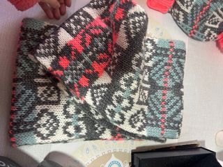 Conjunto de gorro y bufanda de invierno con un diseño llamativo. - Gorro de punto con pompón. - Bufanda a juego. - Colores: gris, blanco, turquesa y rosa neón.