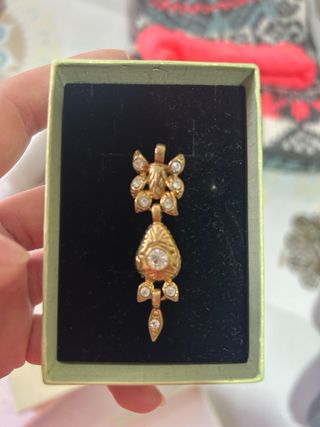 Adrezo huertana, Conjunto de pendientes y joya, de baturra en tono dorado, adornados con piedras transparentes. - Diseño tradicional. - Acabado dorado brillante. - Detalle de piedras. - Cierre de presión en los pendientes.