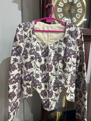 Corpiño de manga larga con un estampado floral en tonos morados y verdes. Diseñado para trajes regionales. - Diseño con escote cuadrado. - Cierre central. - Mangas largas abullonadas en el hombro. Medidas Pecho 73cm Manga de larga 57cm