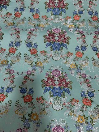 Tela de fallera con un diseño floral vibrante y detallado, ideal para trajes de niña. - Fondo en tono aguamarina. - Motivos florales en rojo, azul, naranja y morado. - Hilos plateados que aportan brillo al tejido. - Patrón repetitivo con ramos y guirnaldas.