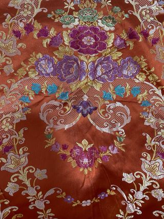 Tela con un diseño floral intrincado en tonos naranjas, morados, verdes y dorados. Ideal para proyectos de costura y tapicería. - Medida: 5.50 metros - Diseño: Floral con detalles en dorado y turquesa.