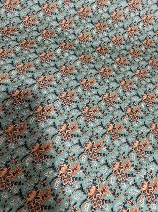 Tela con estampado floral en tonos verdes y ocres. - Diseño de flores y hojas. - Base en color verde menta. - Estilo clásico.