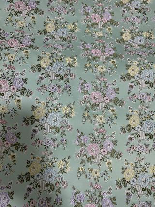 Tela con estampado floral en tonos pastel sobre fondo verde, ideal para confeccionar cuerpos de fallera o chalecos. - Diseño floral - Base en color verde menta. - Motivos florales en rosa, azul, lila y amarillo.