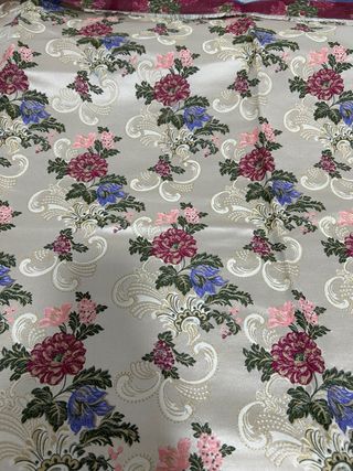 Tela de fallera de 5 metros y medio, ideal para confeccionar un traje completo. - Diseño floral en tonos morados y plateados. - Tejido que no pesa nada