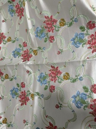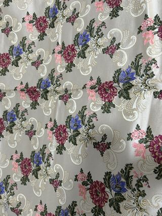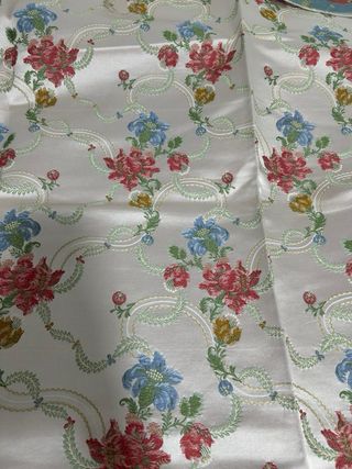Tela de seda con un bonito estampado floral, ideal para confección. - Diseño floral en tonos rojos, azules y amarillos. - Base de seda en color marfil. - Medida: 1 metro de largo.