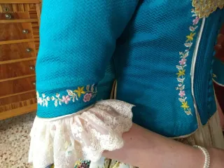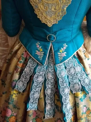Traje de fallera talla 38 para una altura de 1'60 aprox. Falda de seda color champán. Corpiño color turquesa liso, con pequeñas flores bordadas. Manteleta incluida. Largo falda 100cm Cintura 80cm Largo corpiño 45 Largo manga 34 En perfecto estado
