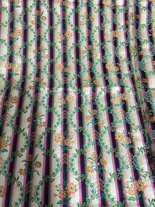 Tela de seda con un diseño de rayas verticales y motivos florales. - Diseño de rayas en varios colores. - Flores y detalles en tonos anaranjados y verdes. - Material: Seda.
