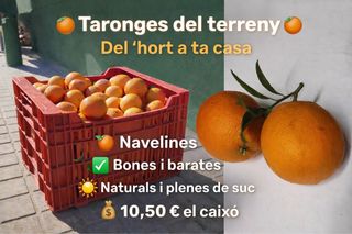 . Taronges navelines acabades de collir del nostre hort, directes a ta casa. Són bones, barates i naturals, plenes de sabor i de suc. • 🍊 Varietat: Navelines • ✅ Qualitat: Bones i barates • 🌿 Característiques: Naturals i amb molt de suc • 💶 Preu: 10,50 € el caixó1