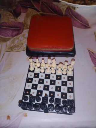 Conjunto de ajedrez portátil de estilo antiguo. - Tablero de ajedrez compacto. - Piezas de ajedrez blancas y negras. - Incluye estuche de almacenamiento rojo