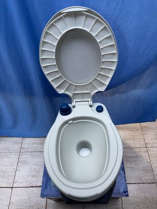 Baño químico portátil, ideal para camping o caravanas. Su diseño compacto facilita su transporte y almacenamiento. - Tapa y asiento abatibles. - Depósito de residuos extraíble. - Bomba de descarga manual. SIN USAR!! no viene con productos.