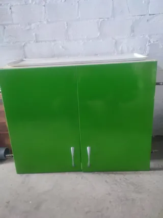 Conjunto de mueble y accesorios de cocina - mueble alto blanco con escurridor doble y bandeja ( puerta con vinilo color verde,se puede quitar y quedar la puerta en blanco) trae doble puerta. - fregadero doble con grifo monomando cromado completo ( incluido latiguillos) - campana extractora marca cata color blanco Precio del conjunto 80€ Recogida en Talavera la real